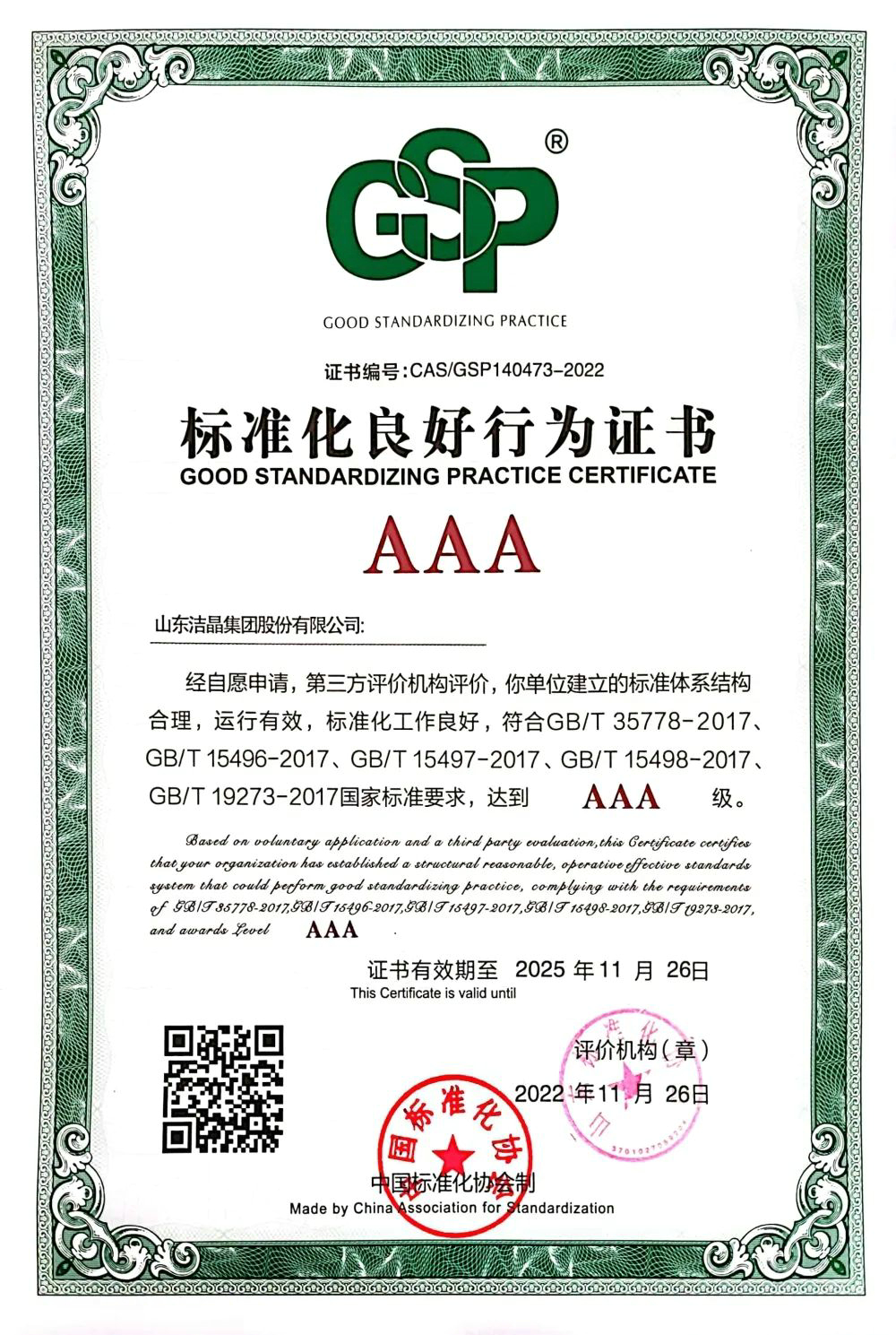 2022年11月26日,經前期申報及第三方評價機構評價審核,潔晶集團獲得AAA級標準化良好行為證書。